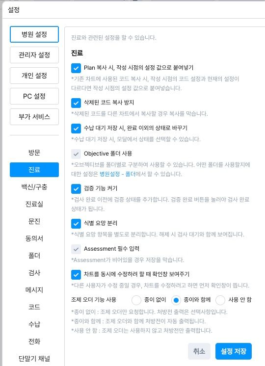 플러스벳 왼쪽하단의 [설정]에서 변경할 수 있습니다. [개인 설정] - [진료]를 통해 원하는 설정을 선택해주세요. 개인 설정이기 때문에 내가 사용하는 계정에 맞게 변경할 수 있어요.