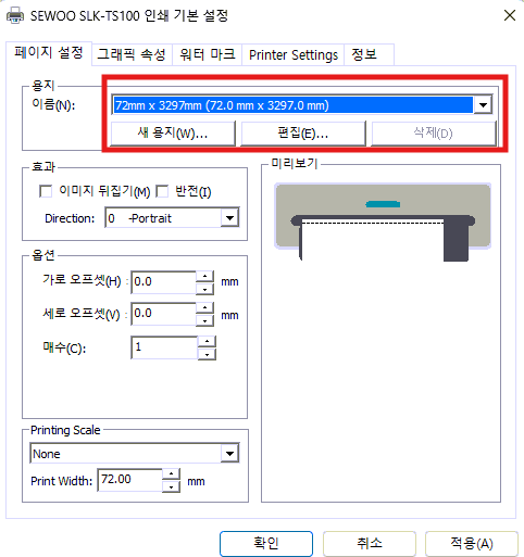 ๋ฐํํ๋ฉด ์๋์ฐ ๊ฒ์์ฐฝ์ ํ๋ฆฐํฐ ๋ฐ ์ค์บ๋ ๊ฒ์ (ํ๋ฆฐํฐ ์์ฑ) - ์ฐ๊ฒฐ ๋ ๋กคํ๋ฆฐํฐ(SLK-TS100) ์ ํ - ์ธ์ ๊ธฐ๋ณธ ์ค์ - ์ฉ์ง ์ต๋ ๊ธธ์ด๋ก ์ค์ ํด ์ฃผ์ธ์.