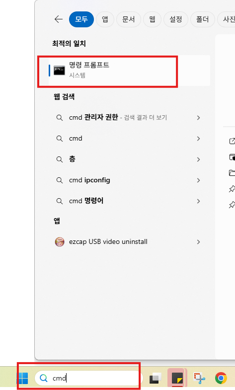 1️⃣ 시작메뉴에서 'cmd' 검색