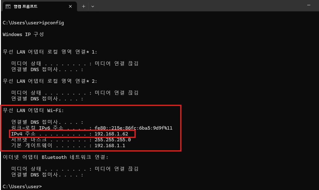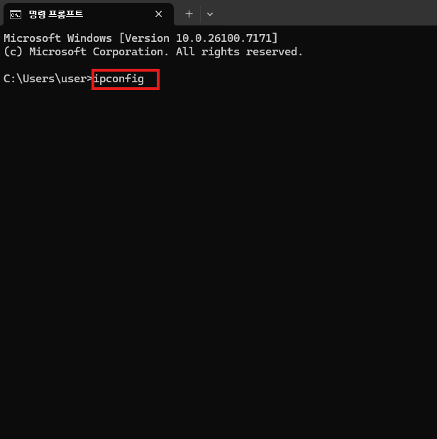 2️⃣명령 프롬프트에서 'ipconfig' 입력 후 엔터