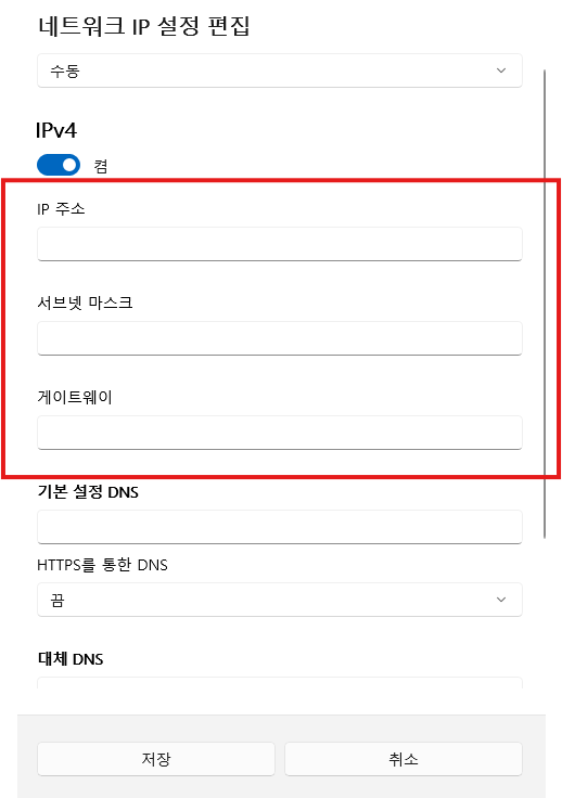 2️⃣해당 내용을 빈칸에 입력 후 저장을 클릭해주세요. 수동으로 변경된 경우 ip 고정 완료입니다.