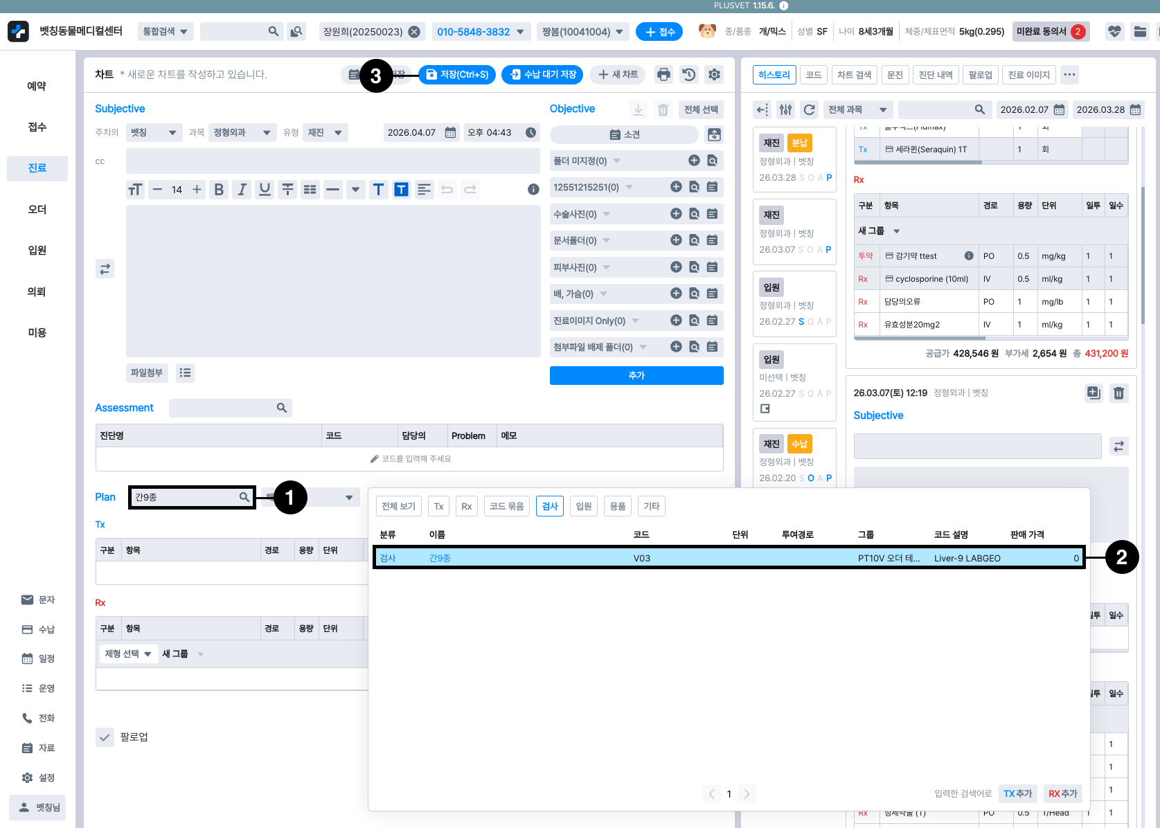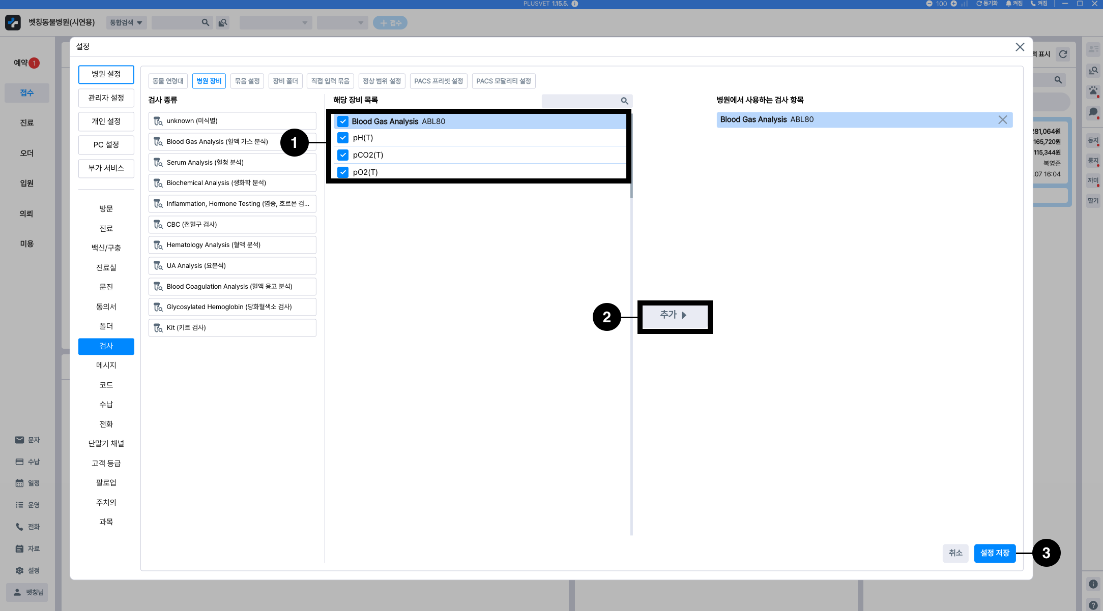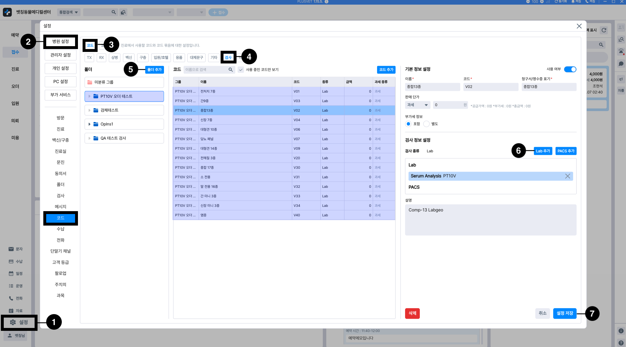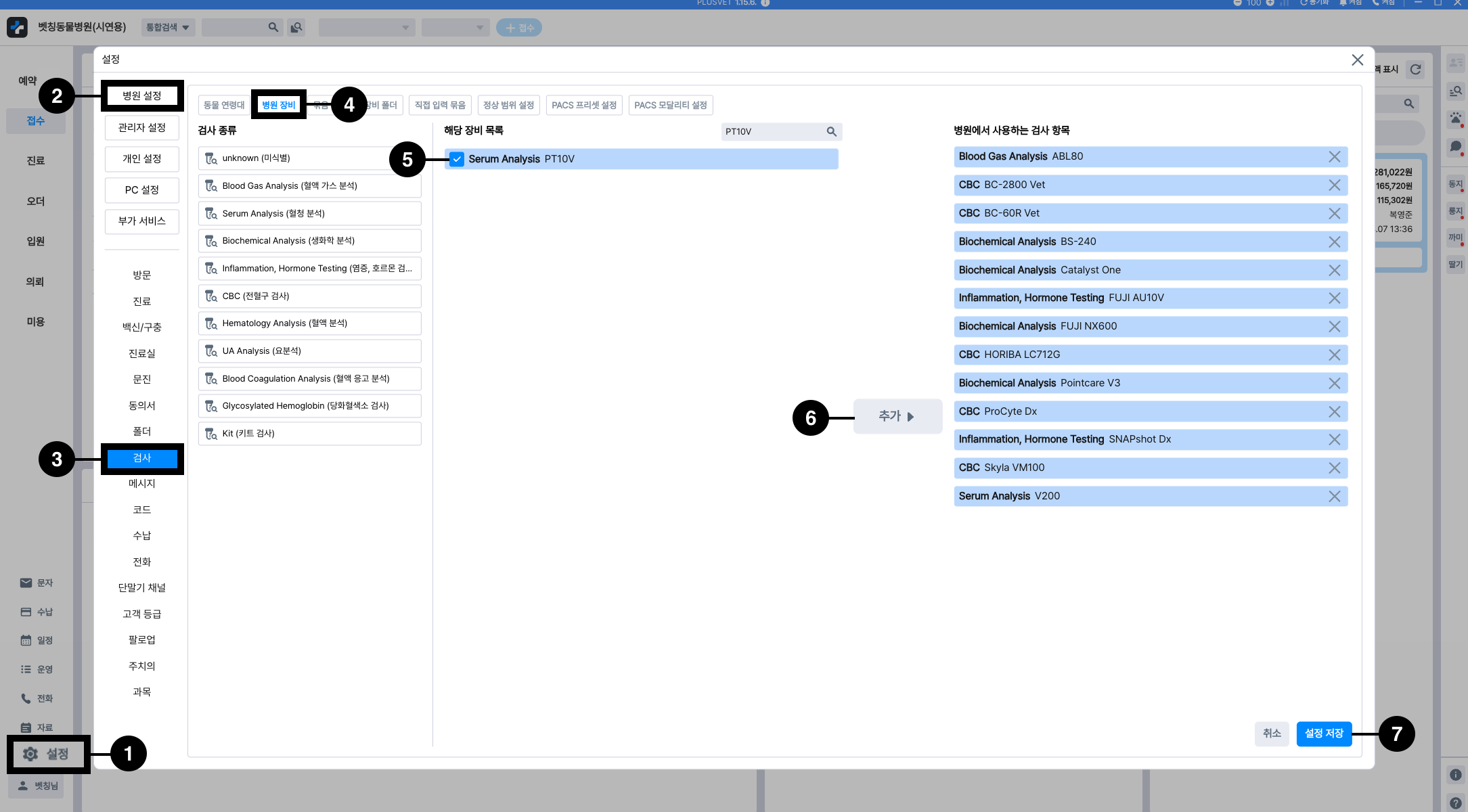 [설정] → [병원 설정] → [검사] → 누락된 검사 항목 추가 후, '설정 저장'