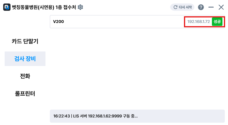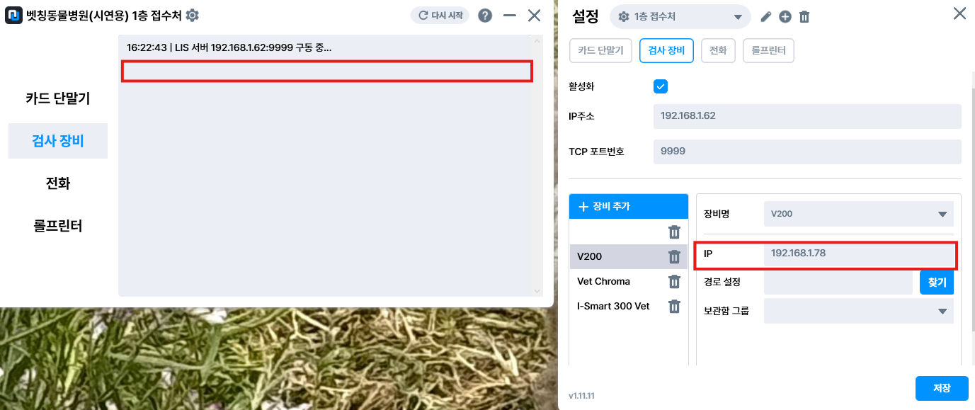 장비의 ip는 장비 자체에서 확인하는 방법이 없어 검사 결과를 전송하여 빅터 하단 로그에 뜨는 장비ip를 보고 [설정- 검사장비 - 해당장비 선택 - ip 입력] 기입해줍니다.