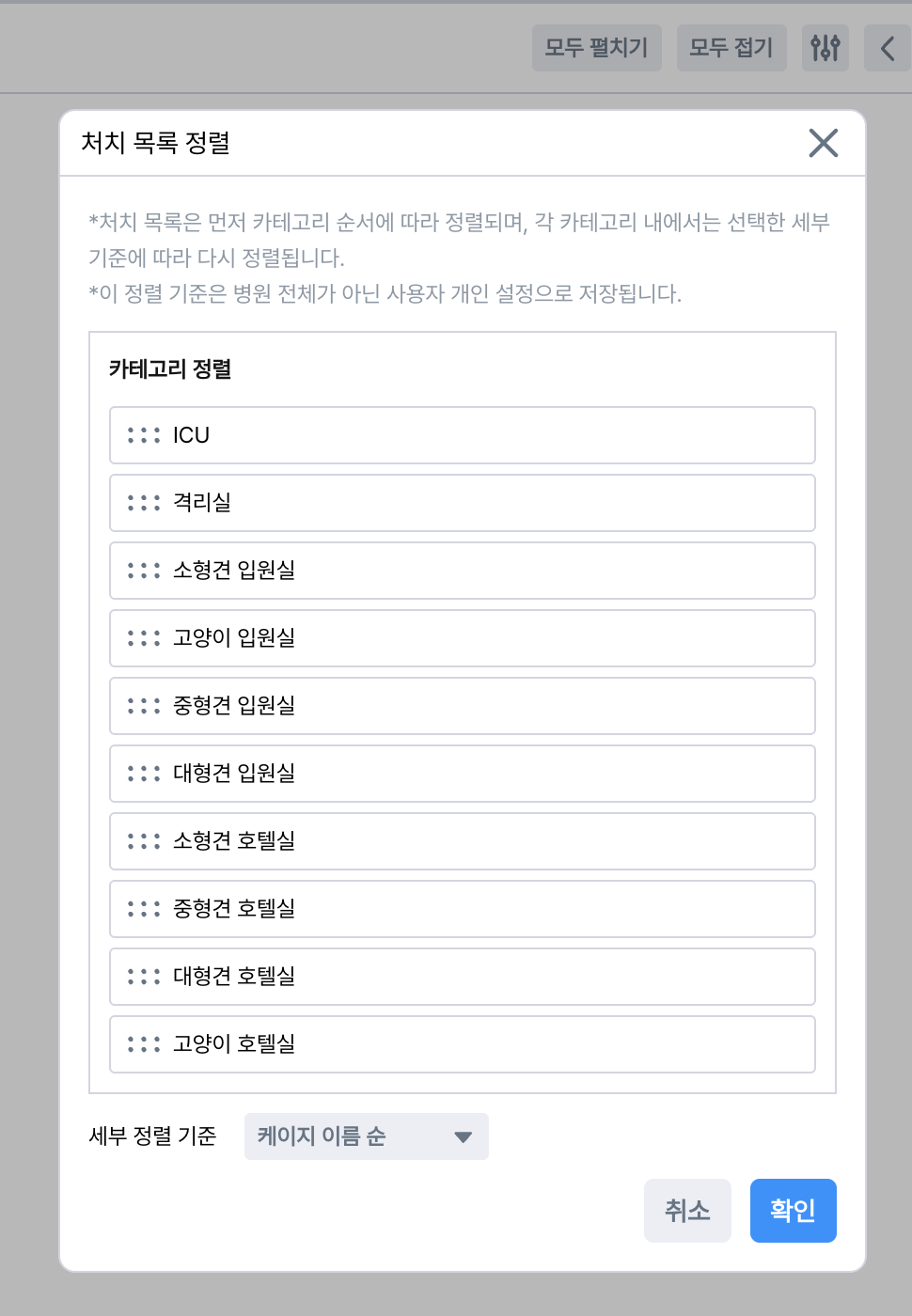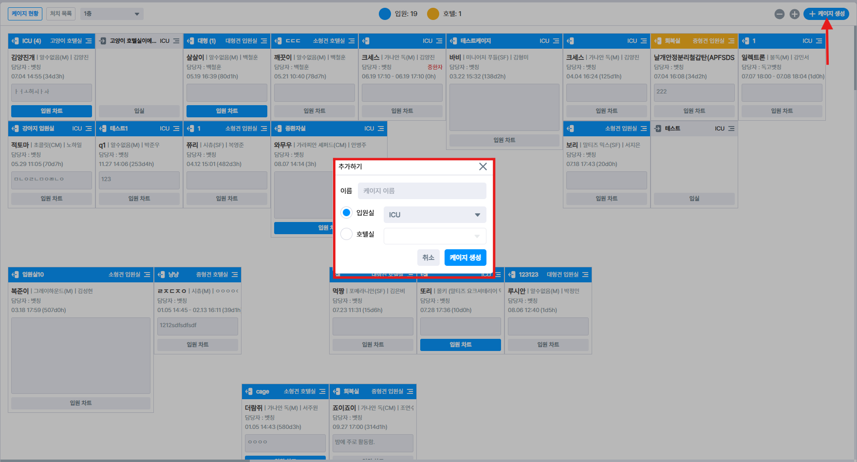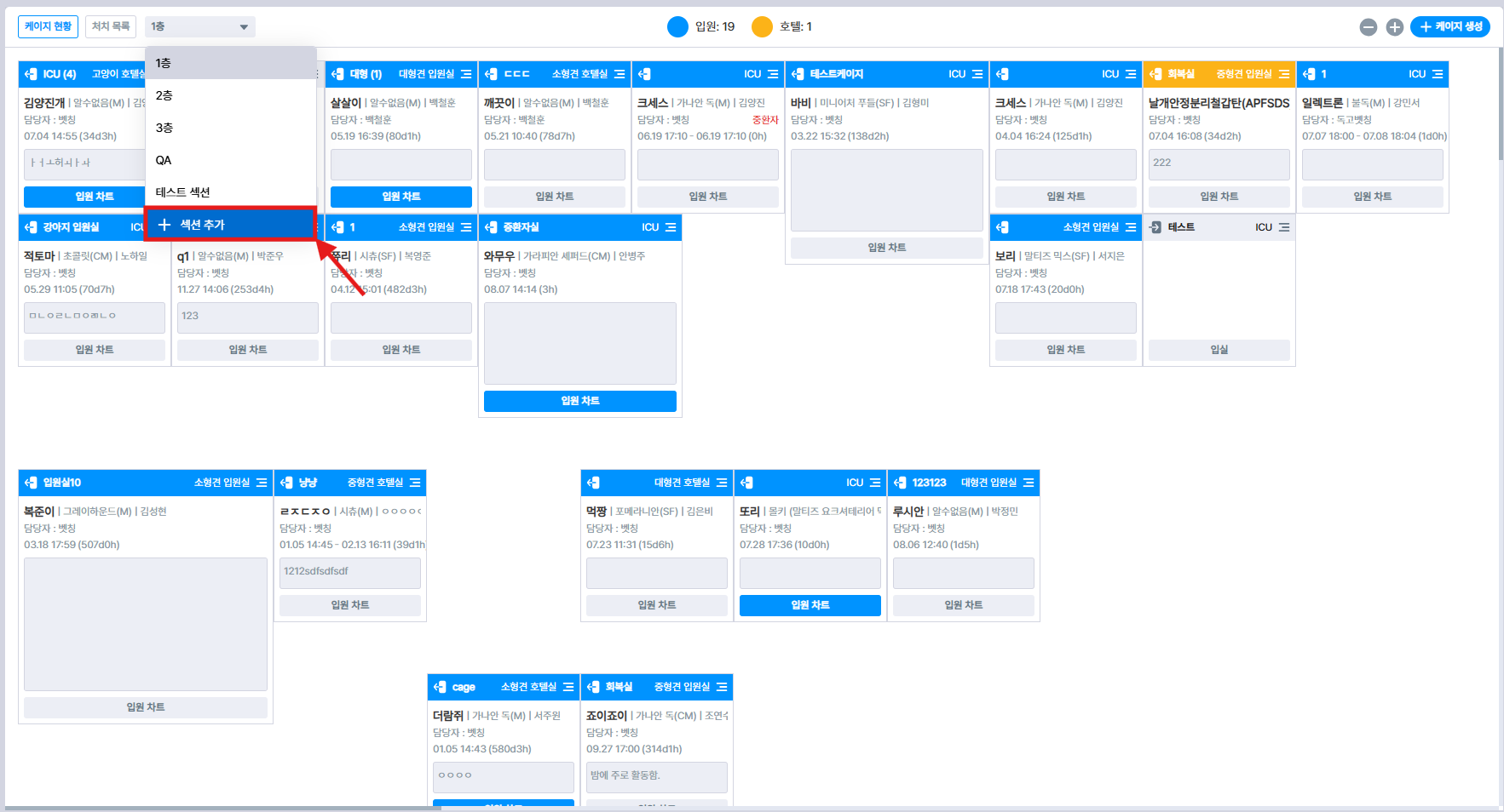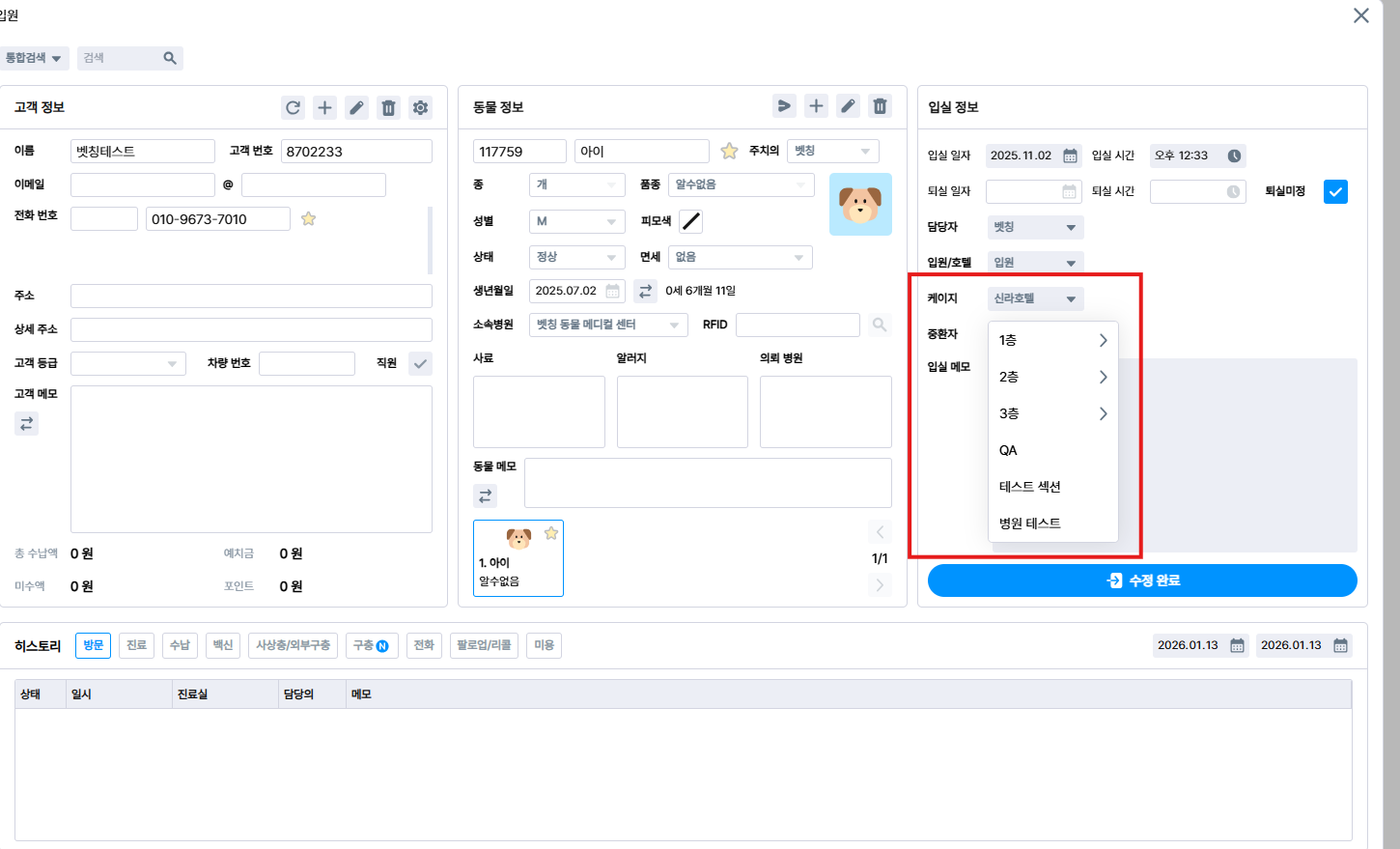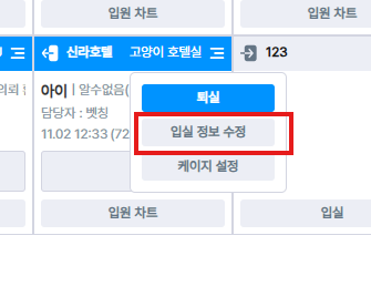 입원실이 따로 있는 경우에는 옮기시려는 입원실 동물 케이지를 선택 후 이동하는 입원실로 선택하면 입실 정보 수정 가능하며, 수정 후 드래그로 이동이 가능합니다.