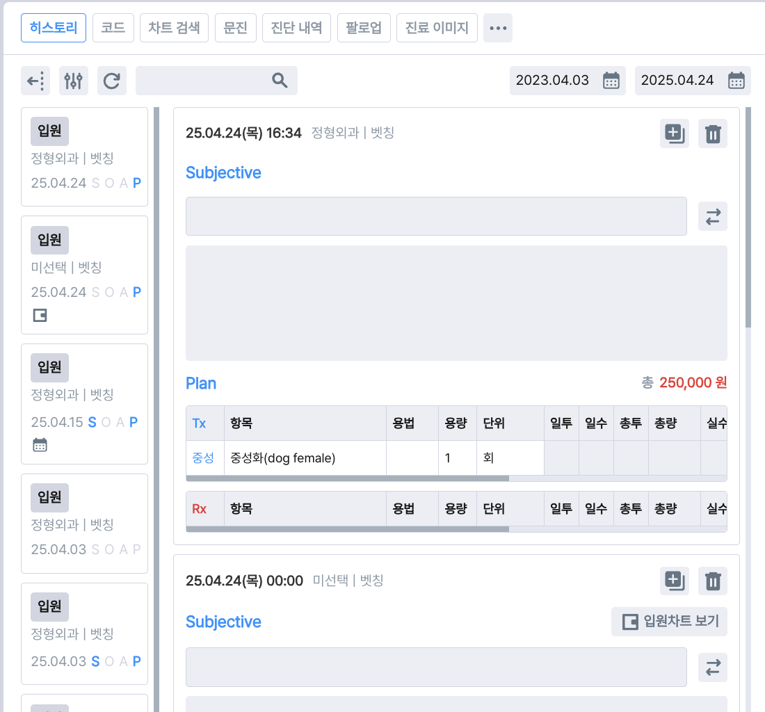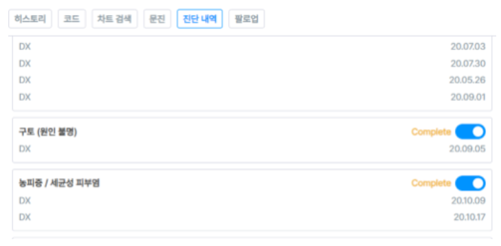 히스토리, 문진, 진단 내역, 팔로업, 진료 이미지는 해당 환자에게 포함 된 내역 확인이 가능합니다.
