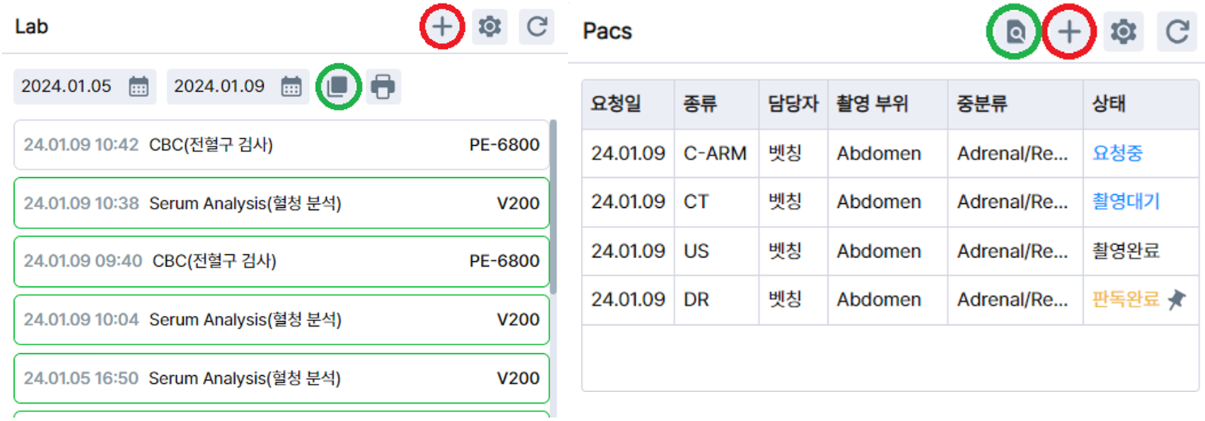 ‘+’ 버튼을 눌러 검사 장비를 선택하고 오더를 추가할 수 있어요.