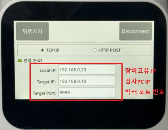 **알맞게 기입 되었으나 연동 실패 시 : HTTP →Disconnect 누르면 표기 되는 DHCP 클릭 하여 장비 IP 다시 맞춰주기