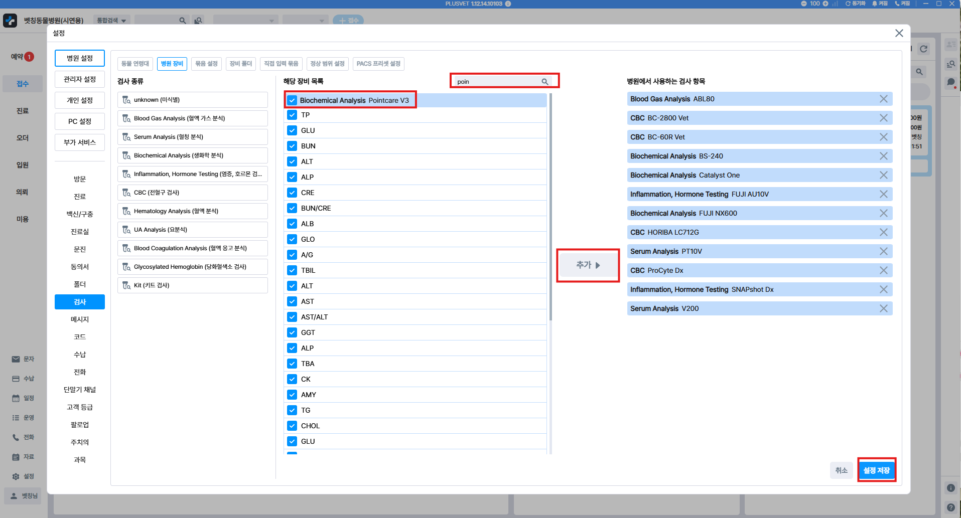 플러스벳 좌측 하단 [설정-병원설정-검사-병원장비]에서 해당 장비 선택 후 추가