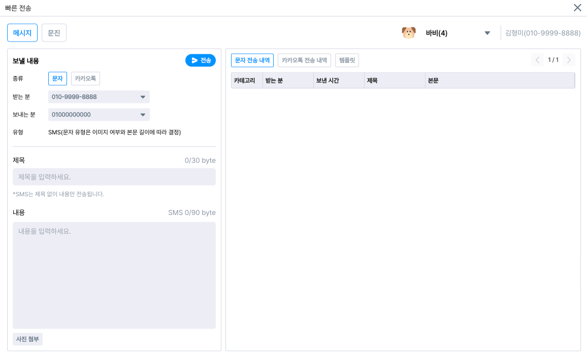카카오톡 연동을 사용 중인 경우, 병원 **[카카오톡 채널]**을 통해 보호자에게 카톡 메시지 발송도 가능해요.