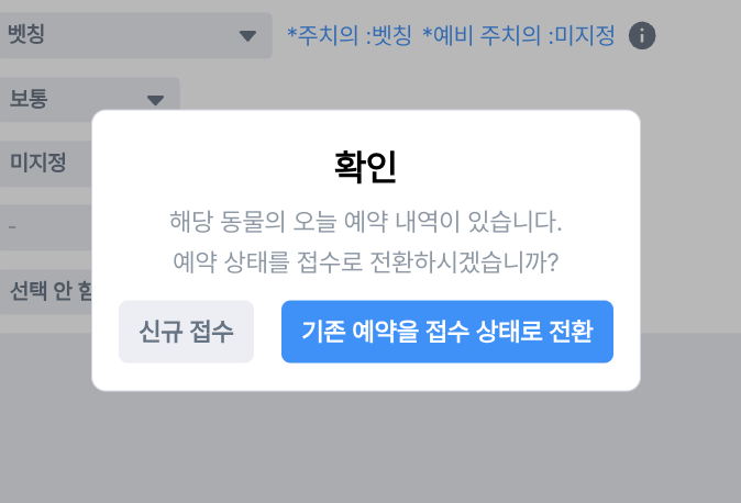 예약이 있는 경우에는 접수 처리할 때 해당 예약을 접수로 전환할지 물어봐요.