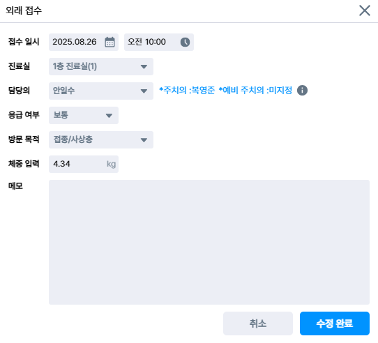 외래 접수로 ‘응급 여부, 방문 목적, 접수 메모’ 등을 입력할 수 있어요.