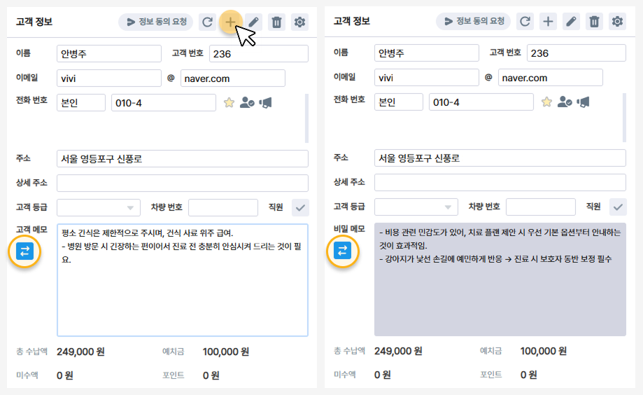 고객메모 아래의 '⇄' 화살표는 내부 직원들만 확인할 수 있는 비밀 메모 기록란이에요.