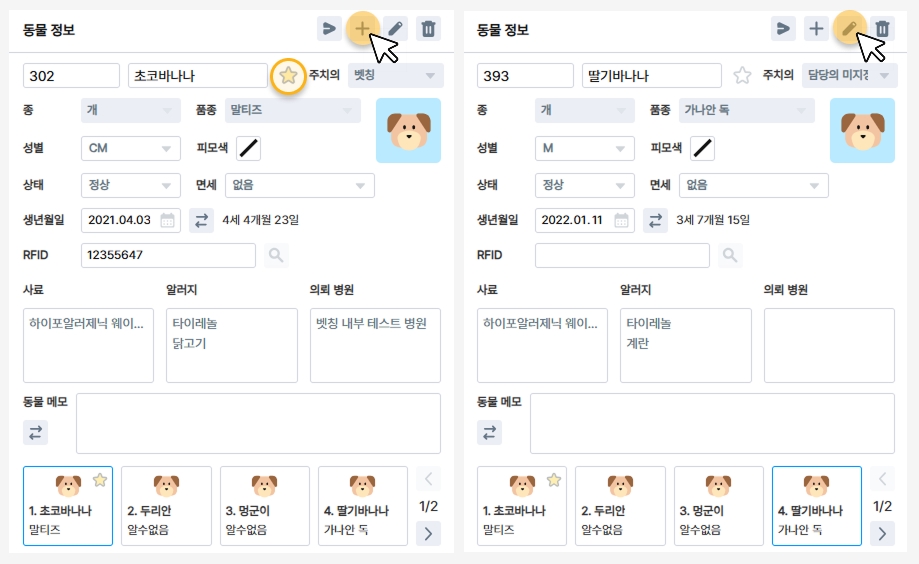 고객이 등록되면 동물 정보 오른쪽 상단에 ‘+’ 버튼으로 동물을 추가할 수 있어요.
