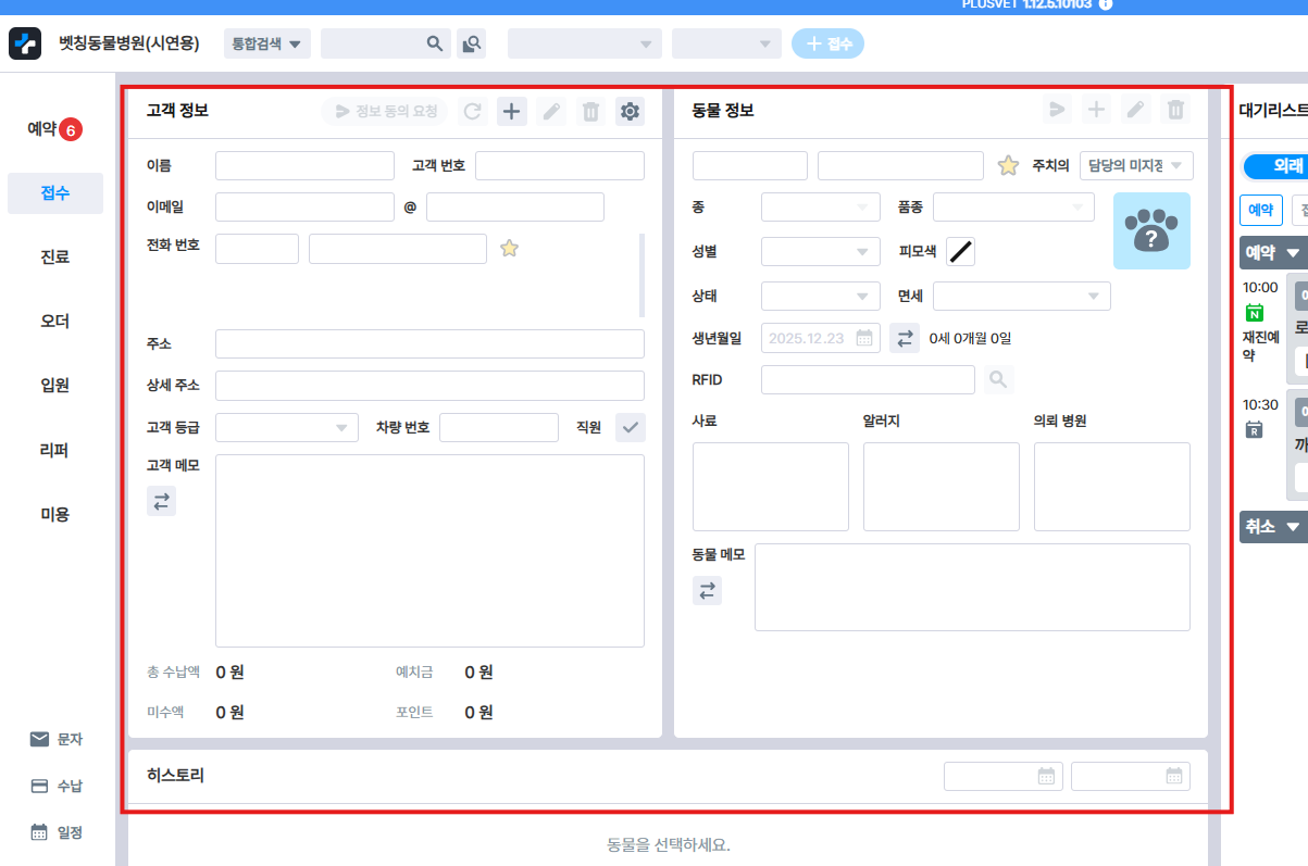 보호자 정보 또는 동물 정보가 중복 등록되어 있는지 확인해 주세요. 예약은 보호자 A로, 접수는 보호자 B로 연결된 경우 대기리스트가 표시되지 않을 수 있습니다.