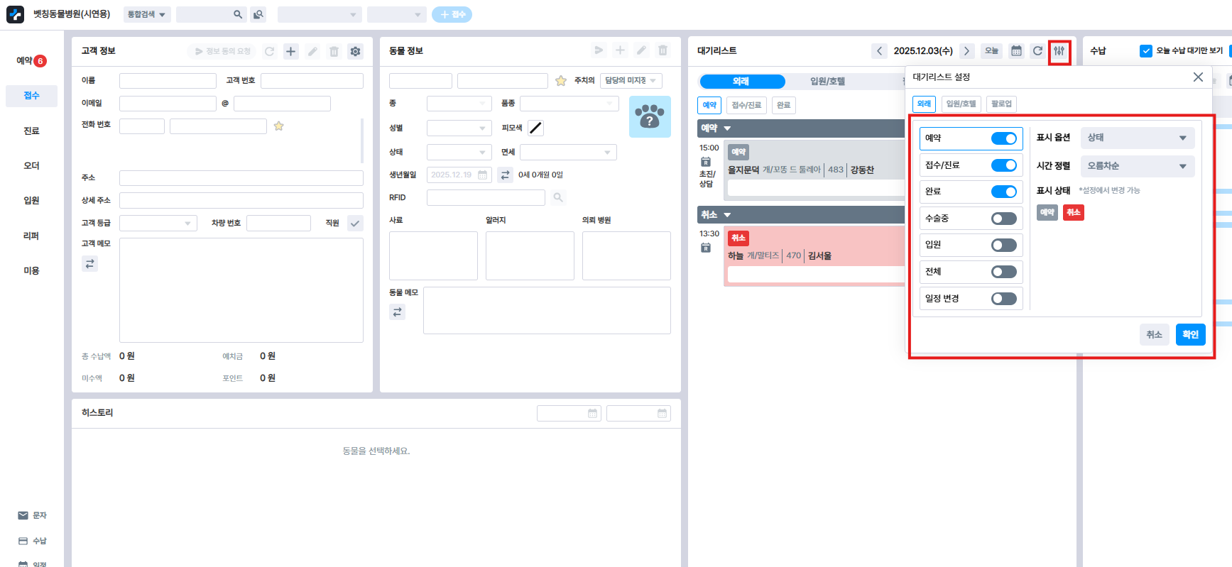 접수 과정에서 ‘기존 고객의 동물 삭제’ 옵션을 잘못 선택하지 않았는지 확인해 주세요. 보호자–동물 연결이 끊겨 대기리스트에 표시되지 않는 경우가 있습니다.