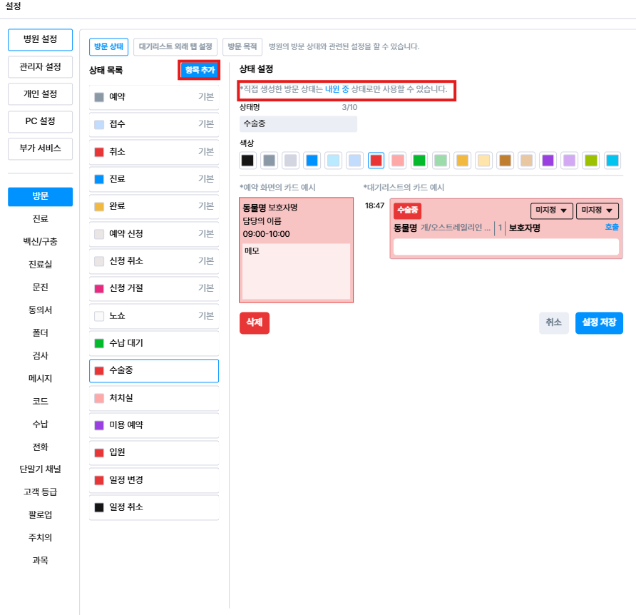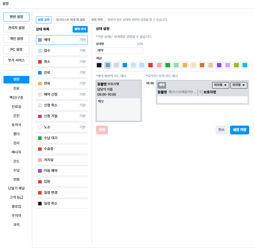방문 상태와 대기리스트 외래 탭 설정은 플러스벳 좌측 하단 [설정 - 병원설정 - 방문] 에서 설정이 가능합니다.
