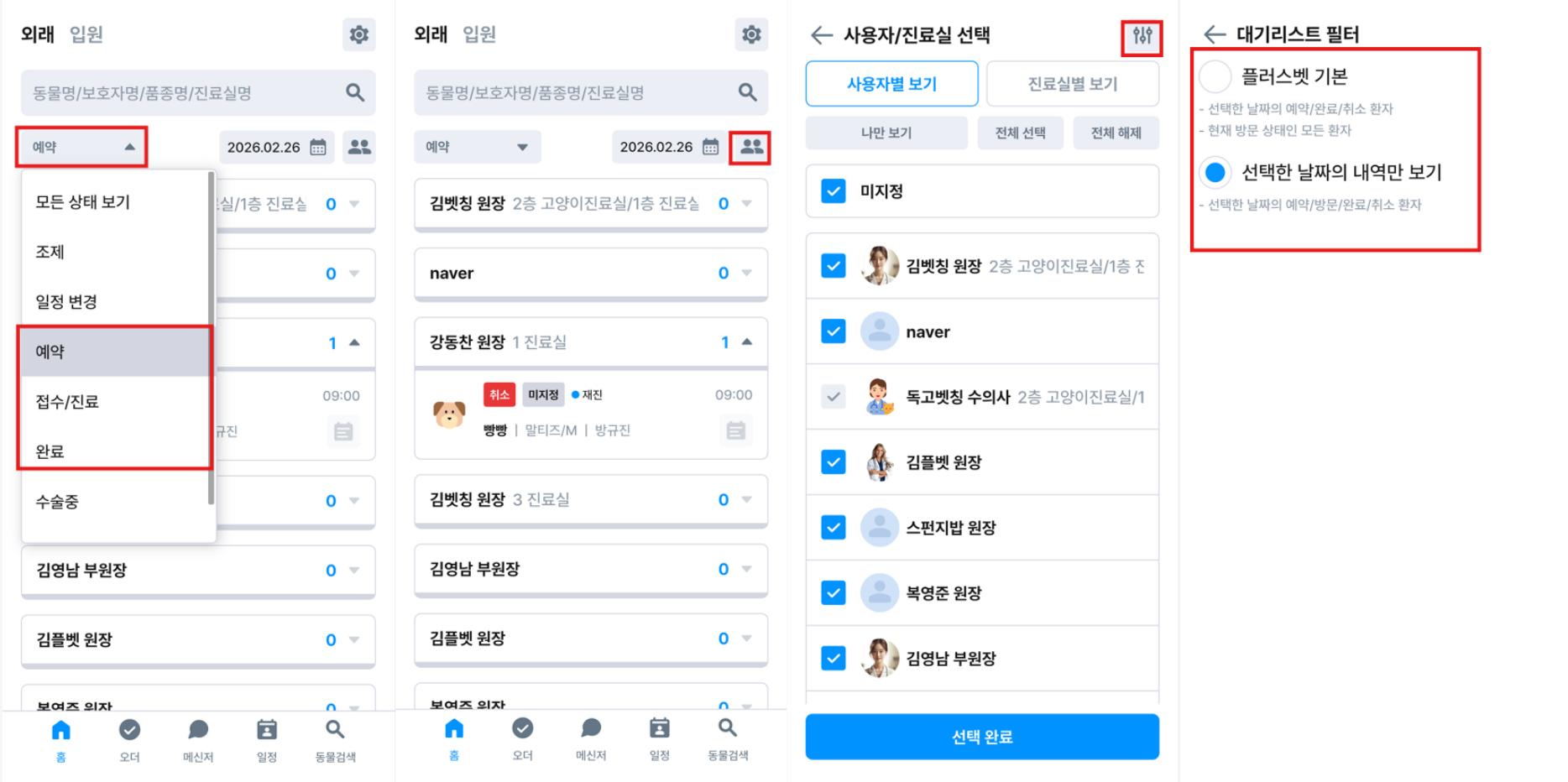 플러스벳 M에서 보여지는 대기리스트에서 오늘 날짜의 예약/접수인것만 보고 싶은 경우 : 좌측 상단 ‘모든 상태 보기’ 드롭다운을 눌러, PC 대기리스트의 예약 / 접수·진료 / 완료 탭과 동일한 보기 설정으로 선택해서 확인하실 수 있습니다. 추가로 우측의 사람 모양 아이콘 클릭 후 우측 상단 필터링 버튼 클릭하여 필터를 전환하시면서 설정 변경 후 확인 부탁 드립니다.