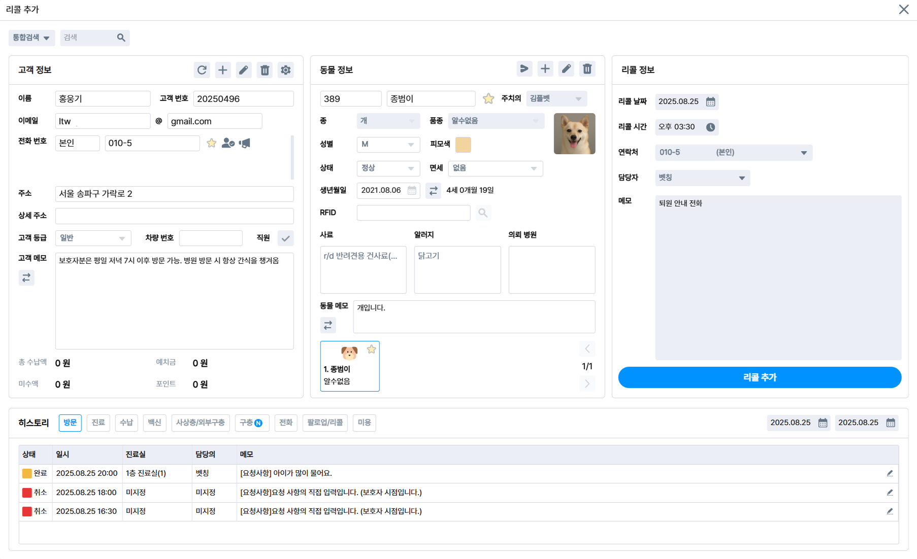 환자를 선택한 뒤, 원하는 시간과 수의사 영역에서 오른쪽 마우스를 클릭하고 ‘리콜 추가’를 선택해요.