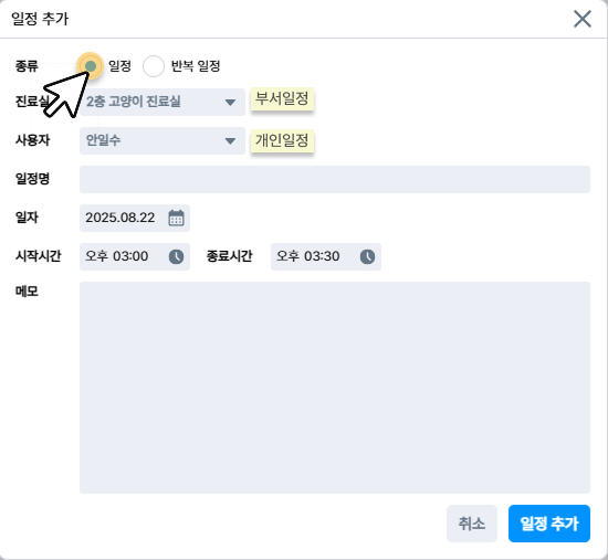 일반 일정은 진료실(부서)별 또는 사용자(개인)별로 생성할 수 있어요.