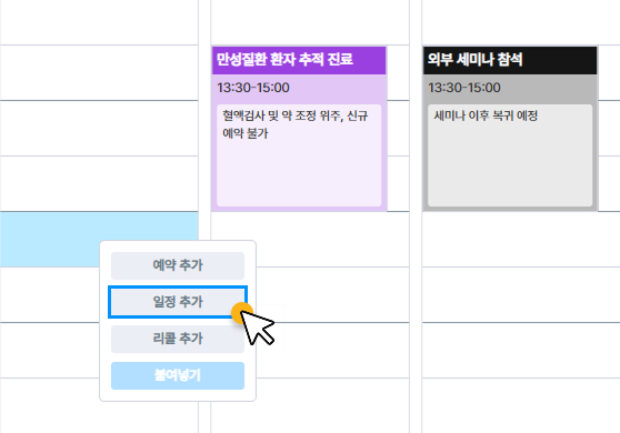 원하는 수의사 또는 부서의 시간에 오른쪽 마우스를 클릭하면, ‘일정’을 추가할 수 있어요.