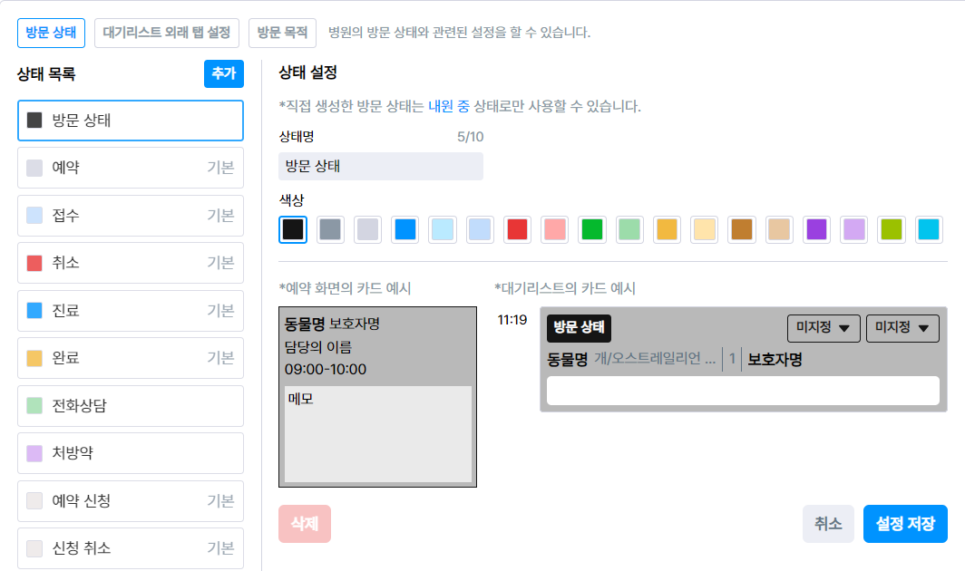 병원의 방문 상태와 관련된 항목을 설정해요.
