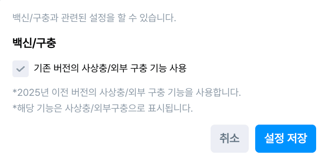 백신과 사상충/외부구충 접종과 관련된 설정을 할 수 있어요.