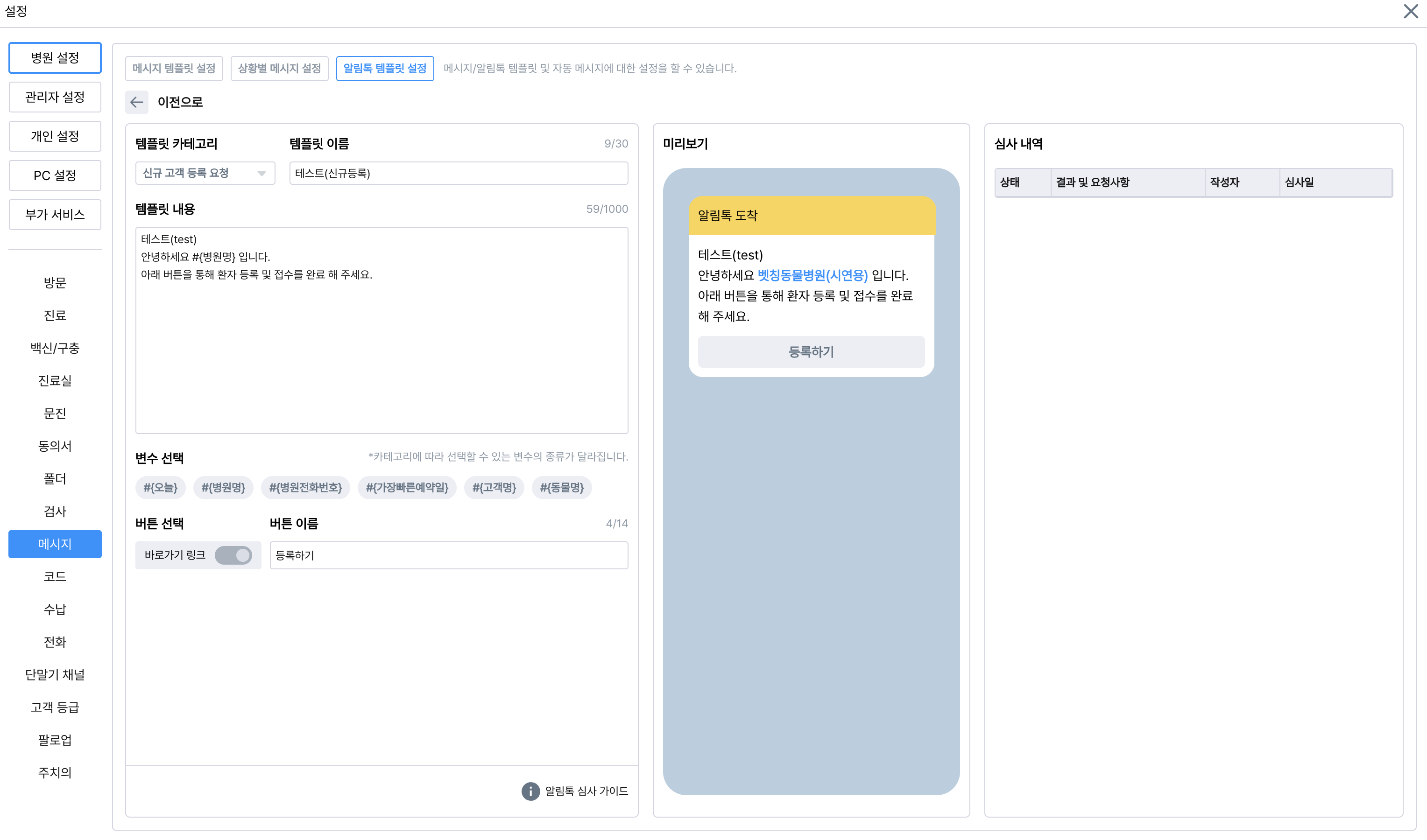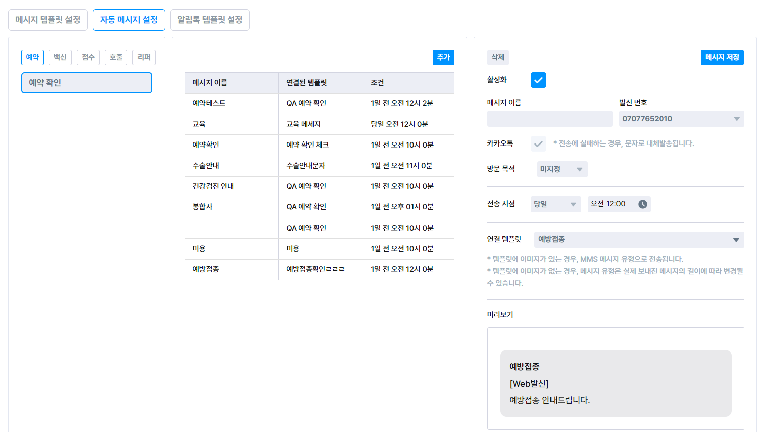 예약/백신/접수/호출/리퍼에 연결할 메시지 템플릿을 추가할 수 있어요.