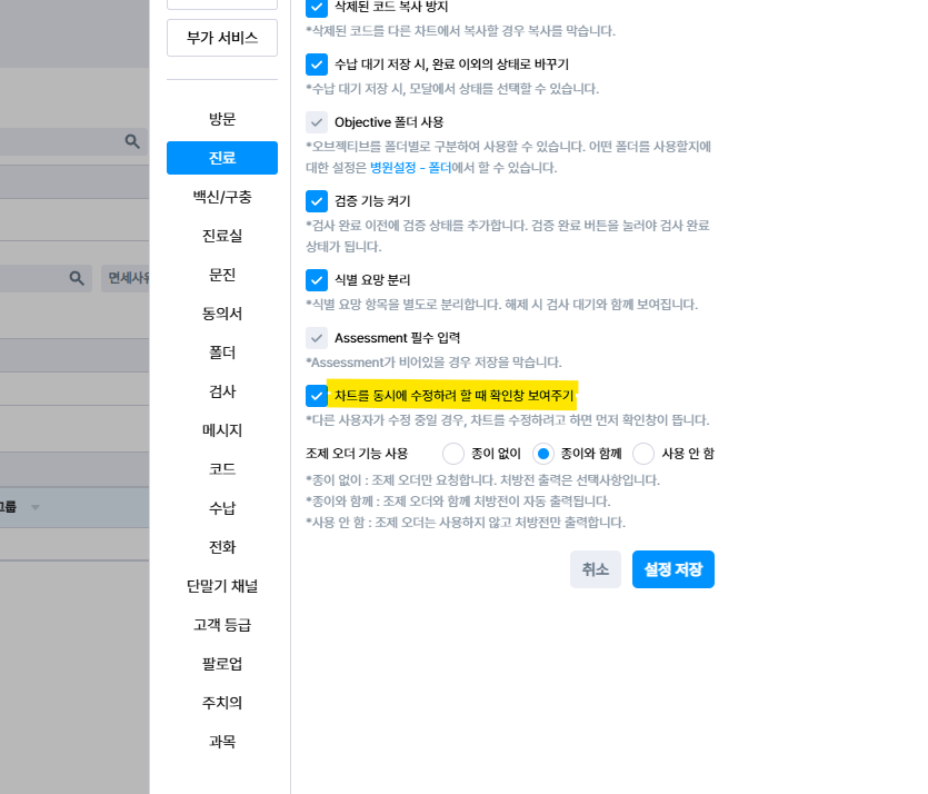 [설정] - [병원설정] - [진료] 에서 차트를 동시에 수정하려 할 때 확인창 [다른 사용자가 편집 중 알림] 보여주기 옵션이 추가되었어요.