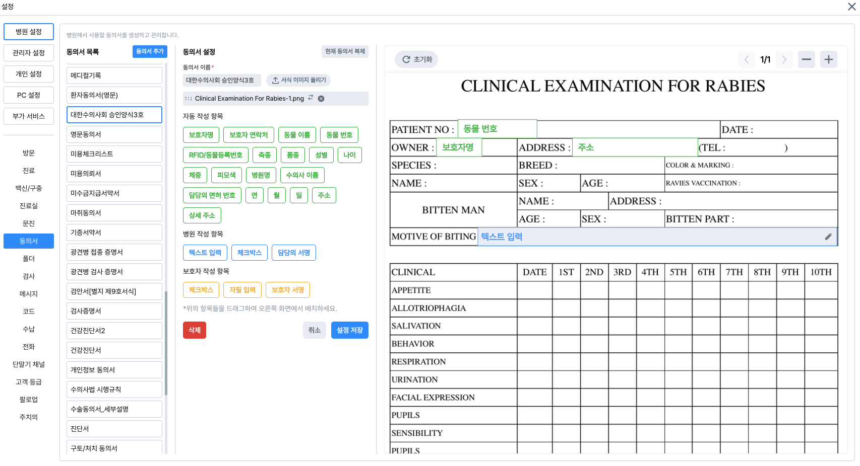 병원에서 사용할 동의서 양식을 직접 등록하고 관리할 수 있어요.