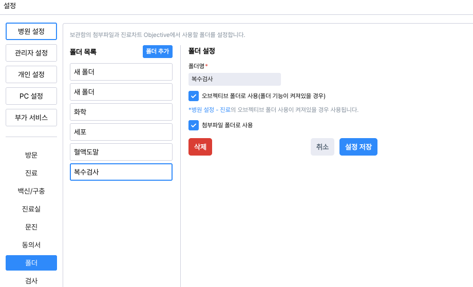 진료탭의 Objective에서 폴더 기능을 사용할지를 정해요.