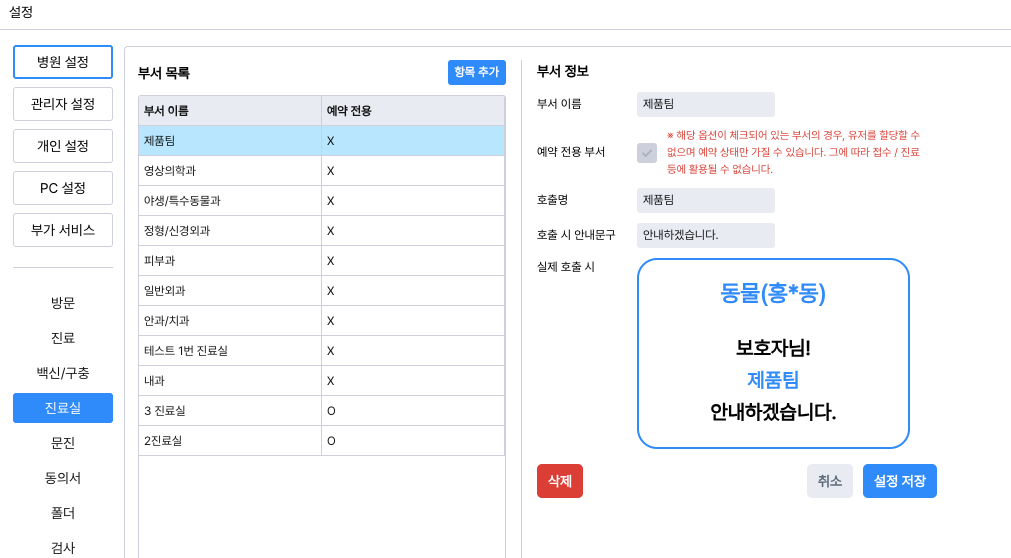 접수실 항목 삭제 : 부서 목록에서 삭제를 원하는 '접수실' 항목을 선택하신 후, 우측 부서 정보 하단의 [삭제] 버튼을 눌러주세요.