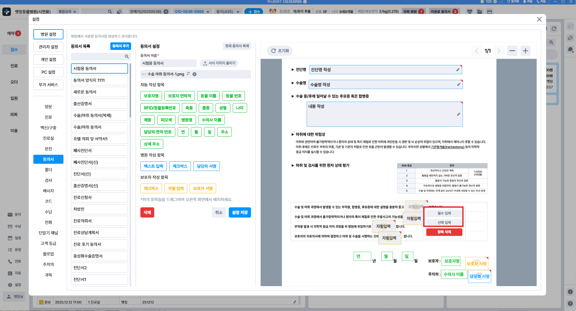 동의서 작성 항목에서 우클릭으로 필수 입력 및 선택 입력 설정이 가능합니다. 필수 입력의 경우 네모칸 상단에 빨간색으로 표시됩니다. 필수 항목의 경우 빠짐없이 입력해주셔야 저장이 가능합니다.
