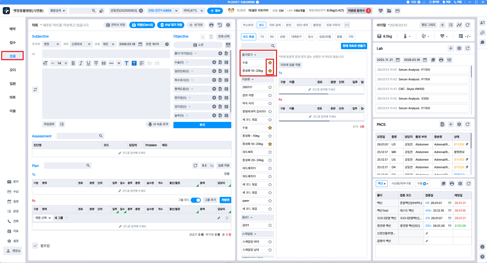 코드 즐겨찾기 설정은 [진료 - 코드] 에서 추가 및 해제가 가능합니다. 즐겨찾기는 코드와 코드묶음 모두 설정이 가능합니다.
