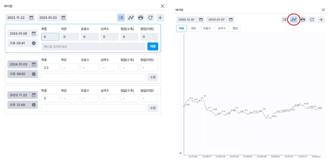 [+] 버튼을 눌러 체중, 체온, 호흡수, 심박수, 혈압 등을 입력해요.